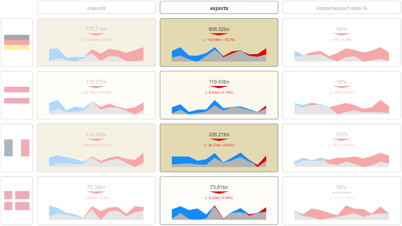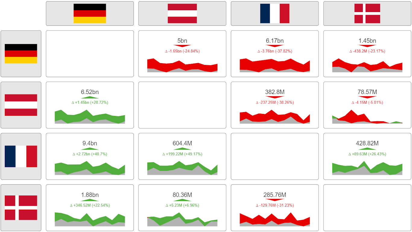 Choosing the matrix, users can, just like with the standard matrix visual, visualize relationships of data with two different dimensions at once, or the relationship of two dimensions to each other. KPI Matrix is a matrix made of single KPI cards, descriptive texts or images being the row and column headers.