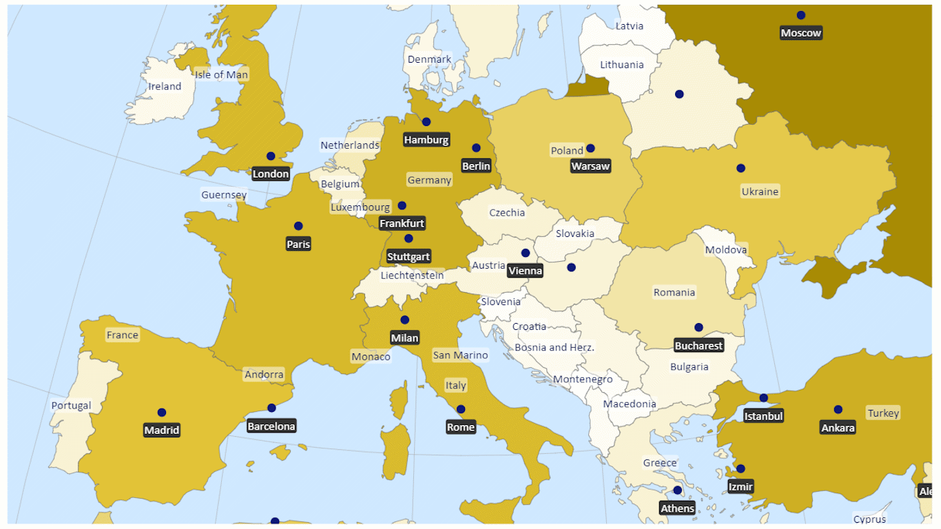 Choose from multiple visualization styles including choropleth (area coloring), point markers, mini charts, labeled routes, and geo‑coordinate‑based connections. Each map element—area, point, or line—can be individually formatted and selected to present KPIs with precision and clarity.