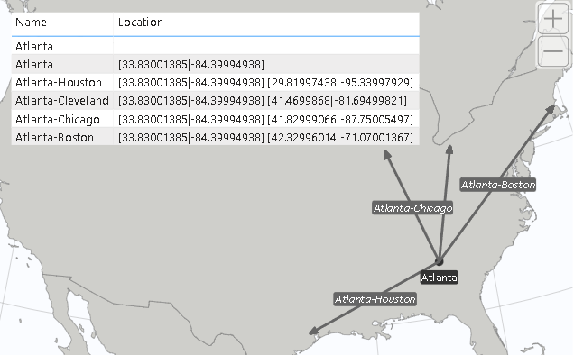 Similar to how points are projected on a map, you can also draw lines by defining their start and end points in the form of [latitude|longitude] [latitude|longitude]. For example, to draw a line from Berlin to New York City, you would use the measure value "[52.52|13.40] [40.75|-73.98]". Note that line definitions are not limited to just two coordinates, allowing you to visualize multiple connected lines (e.g., multi-stop routes).