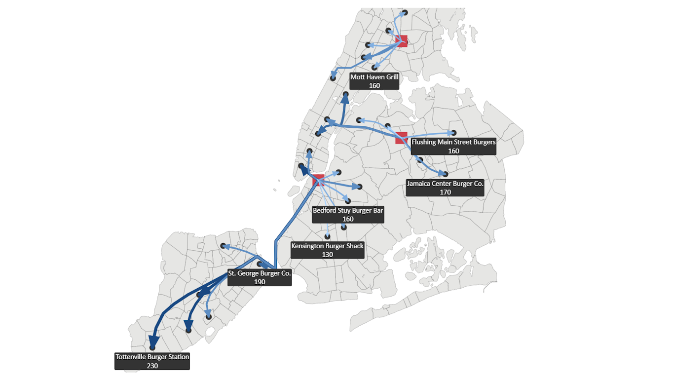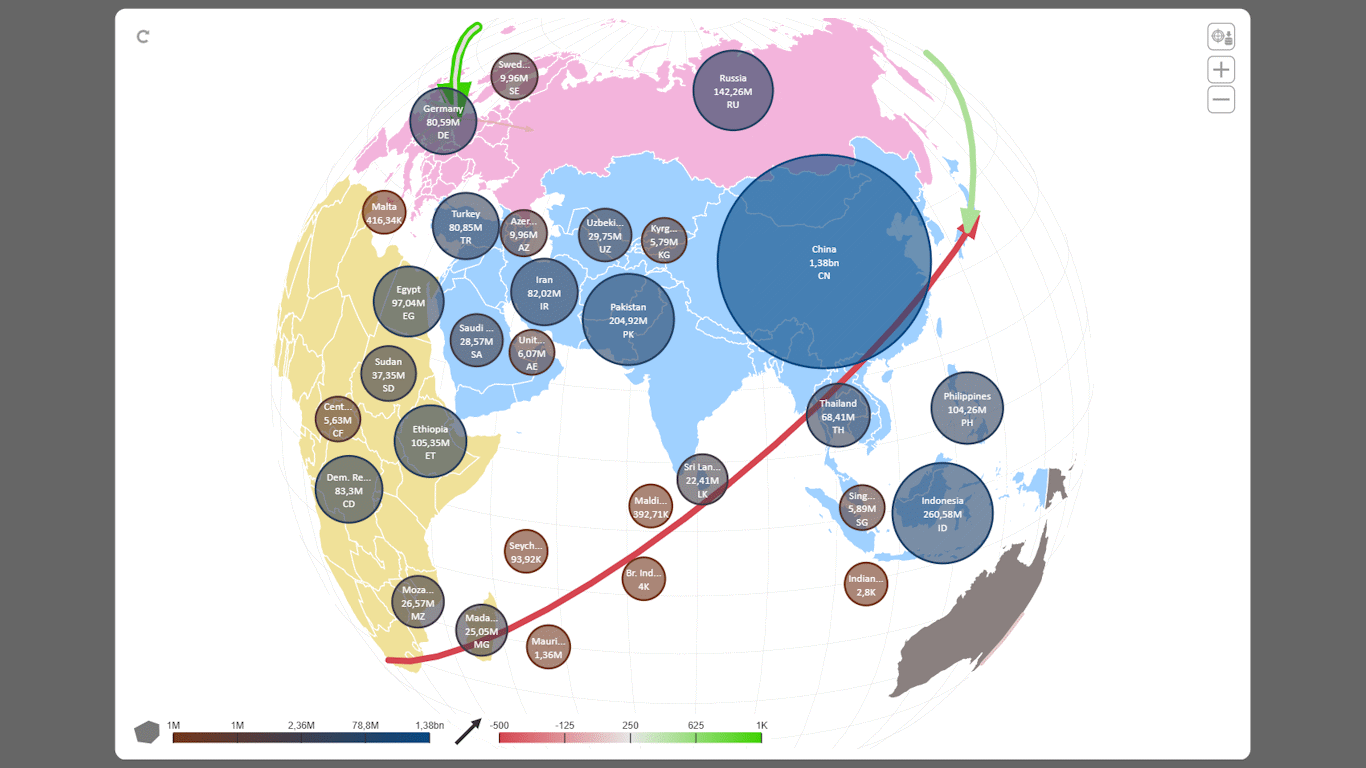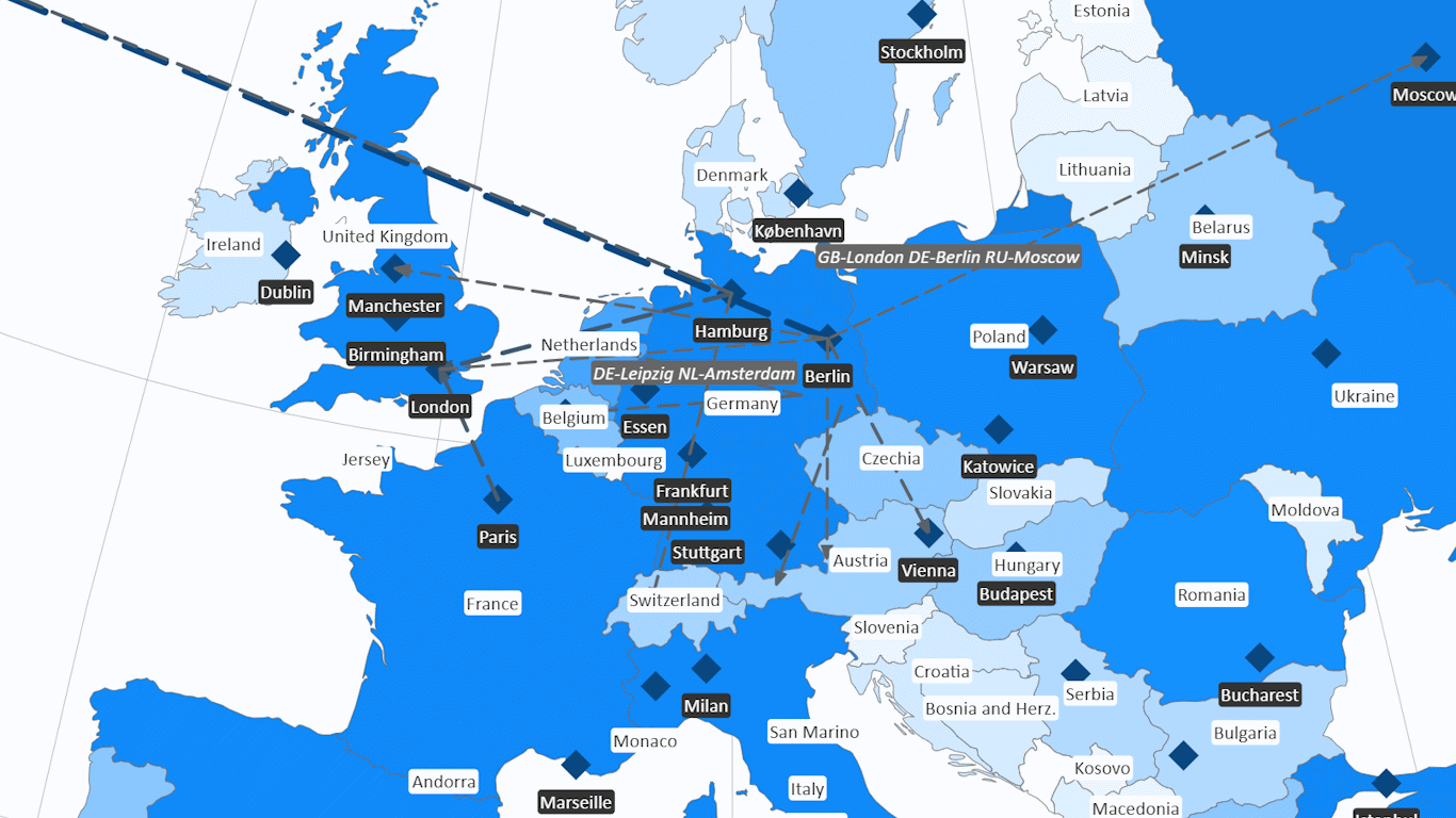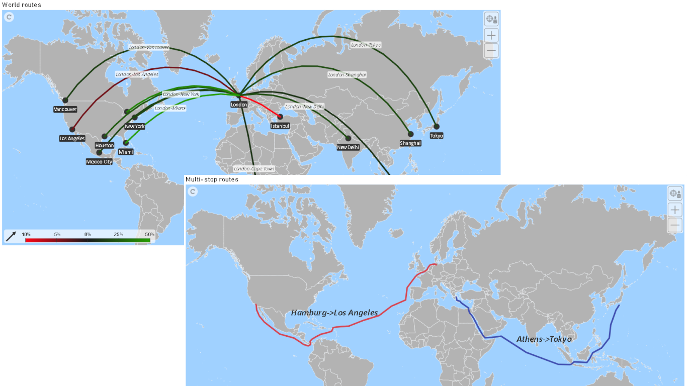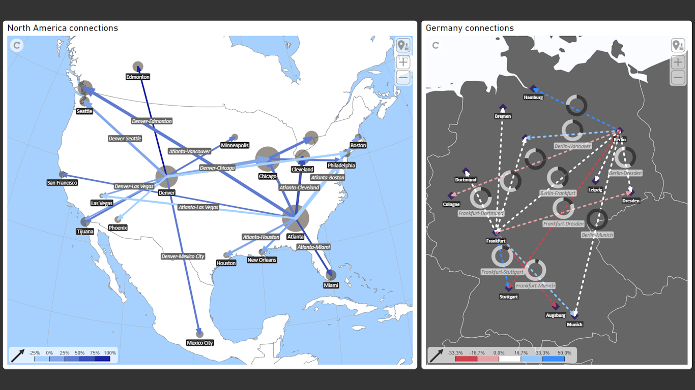 Choose from multiple visualization styles including choropleth (area coloring), point markers, mini charts, labeled routes, and geo‑coordinate‑based connections. Each map element—area, point, or line—can be individually formatted and selected to present KPIs with precision and clarity.