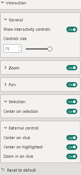 Show interactivity controls - Toggle to display buttons directly on the visualization that allow convenient control of interaction settings. The buttons are located on the left side of the visual. For documentation on each button, see Interactivity controls. This is a premium feature.