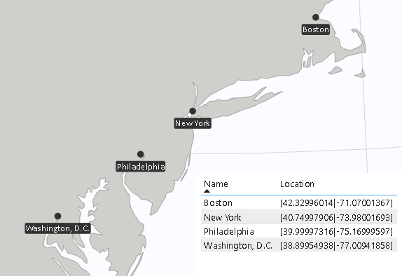 To project points on a map (e.g., cities or your company's locations), provide the point's geographic coordinates in the form [latitude|longitude]. For example, to display Berlin, Germany, on the map, use the measure value [52.52|13.40], and for New York City, use [40.75|-73.98].
