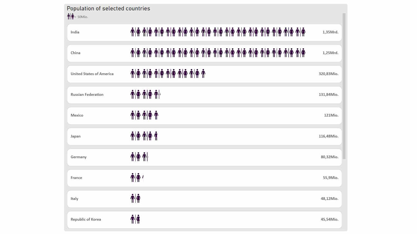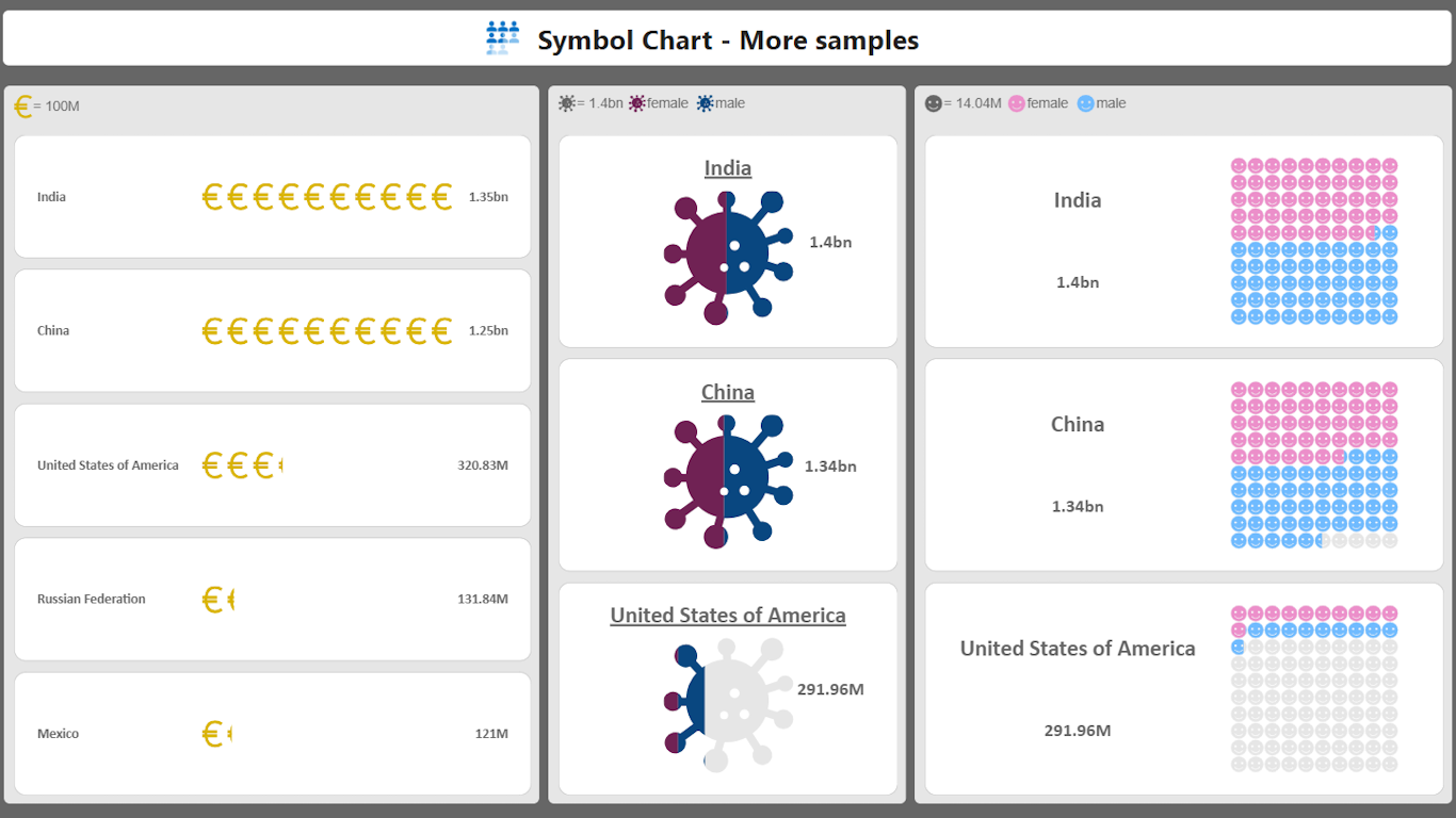 Symbol Chart is a powerful and flexible Power BI chart visual. Conveniently create stunning charts that connect to the real world objects behind the figures in an intuitive and compact way.
